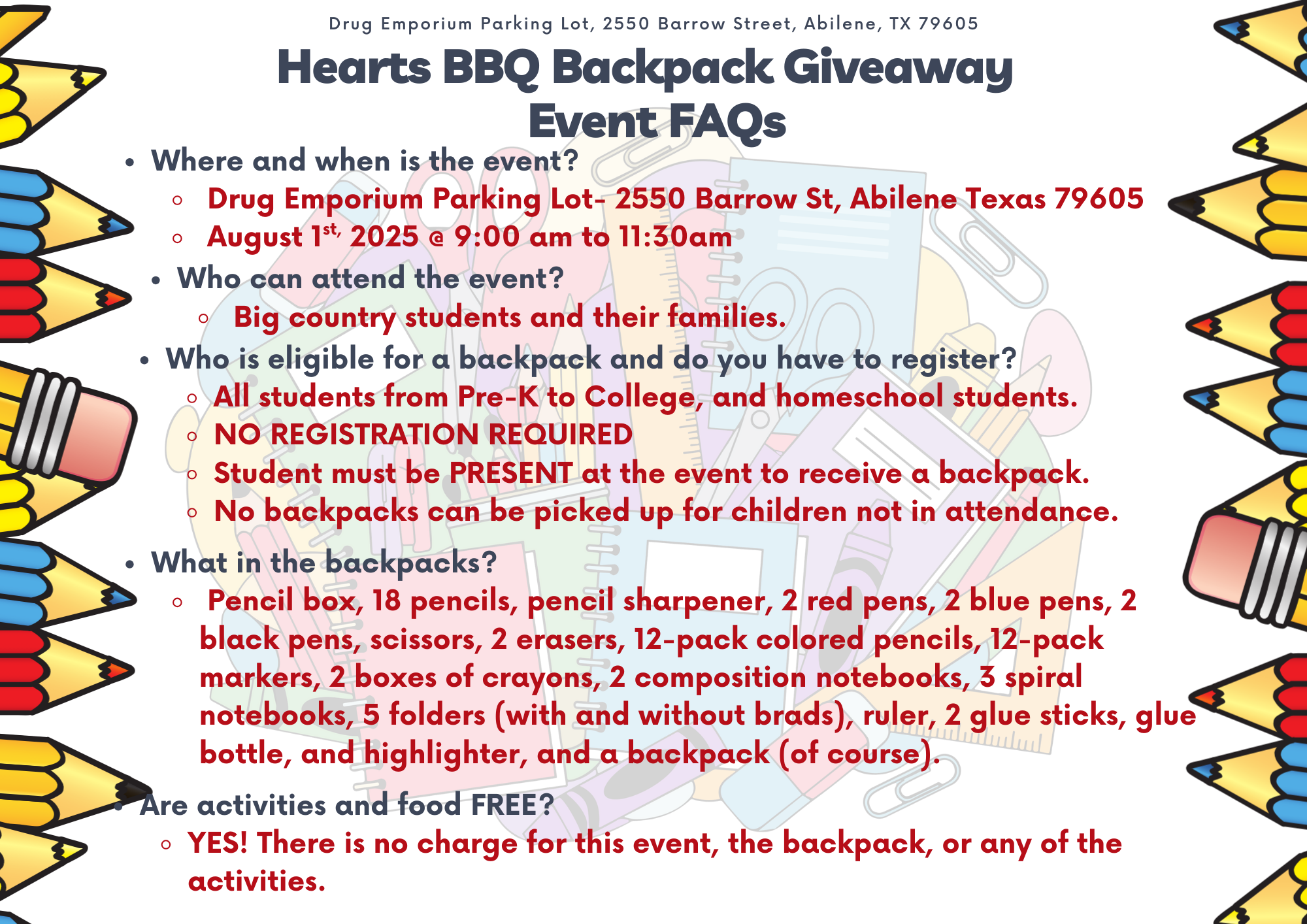 Today, the Hearts BBQ Backpack Giveaway is an expected and deeply needed annual event, where families come not only to receive backpacks, but to gather, connect, and feel the love of the Abilene community. For a few meaningful hours, children leave prepared for school — and reminded they are supported.